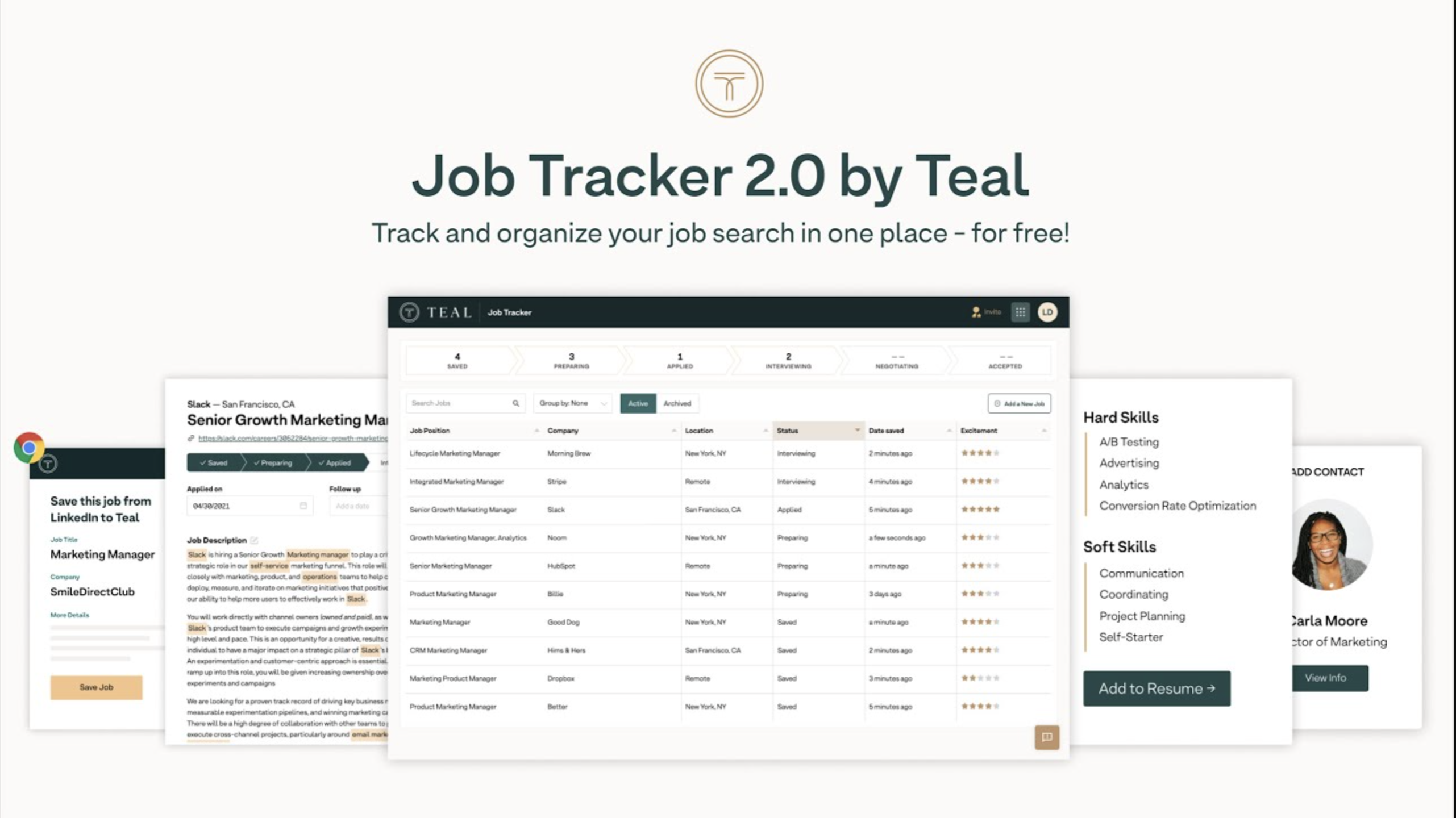 Teal has made waves in 2025 by being more than just a builder; it’s a career hub. Its standout feature is the Job Application Tracker, which lets you bookmark jobs from LinkedIn or Indeed and manage them in a Kanban-style board.