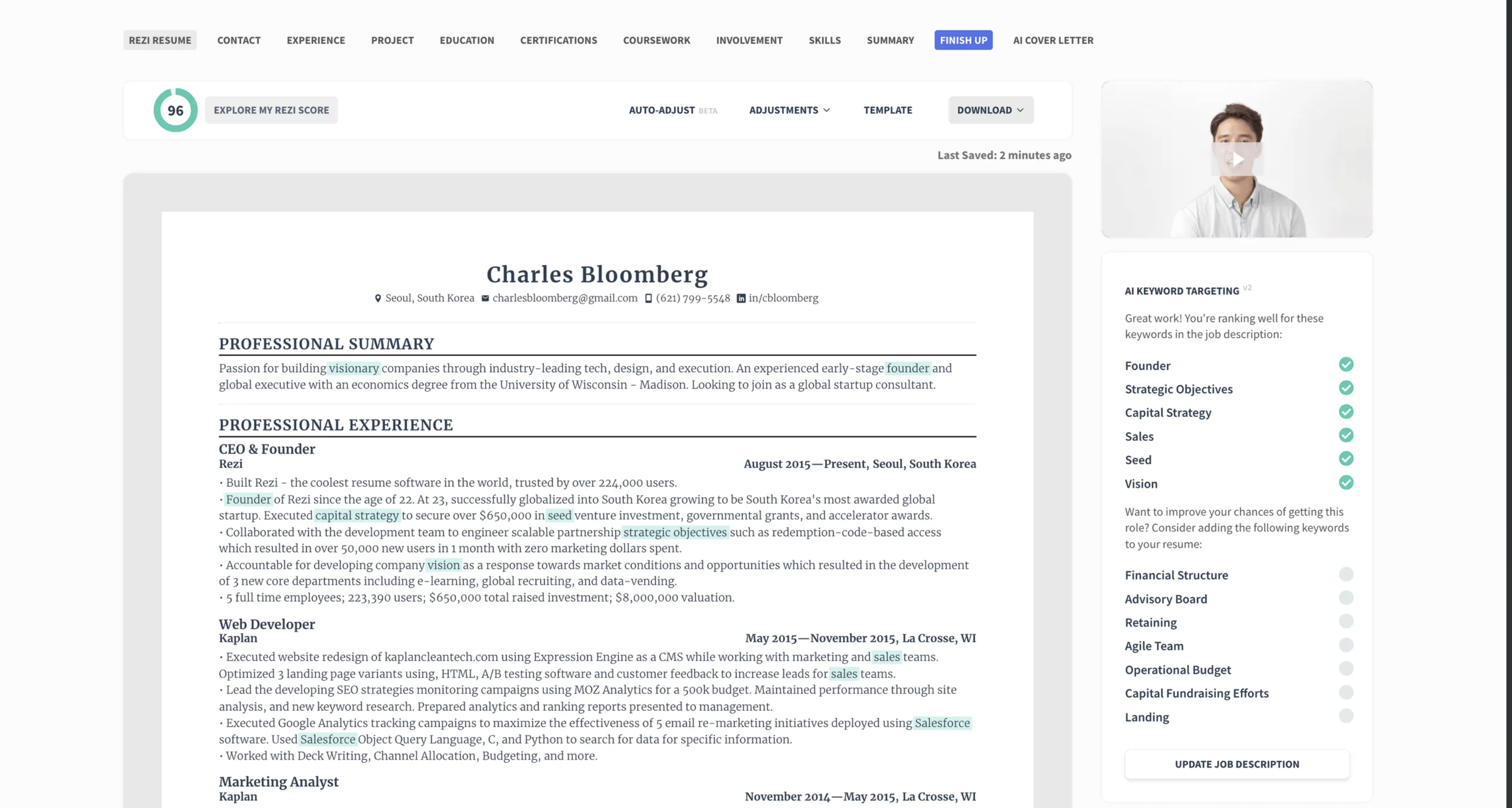 Rezi is obsessed with the Applicant Tracking System (ATS). Their builder forces you into a very specific, standardized format that is guaranteed to be parsed correctly by even the oldest ATS software.